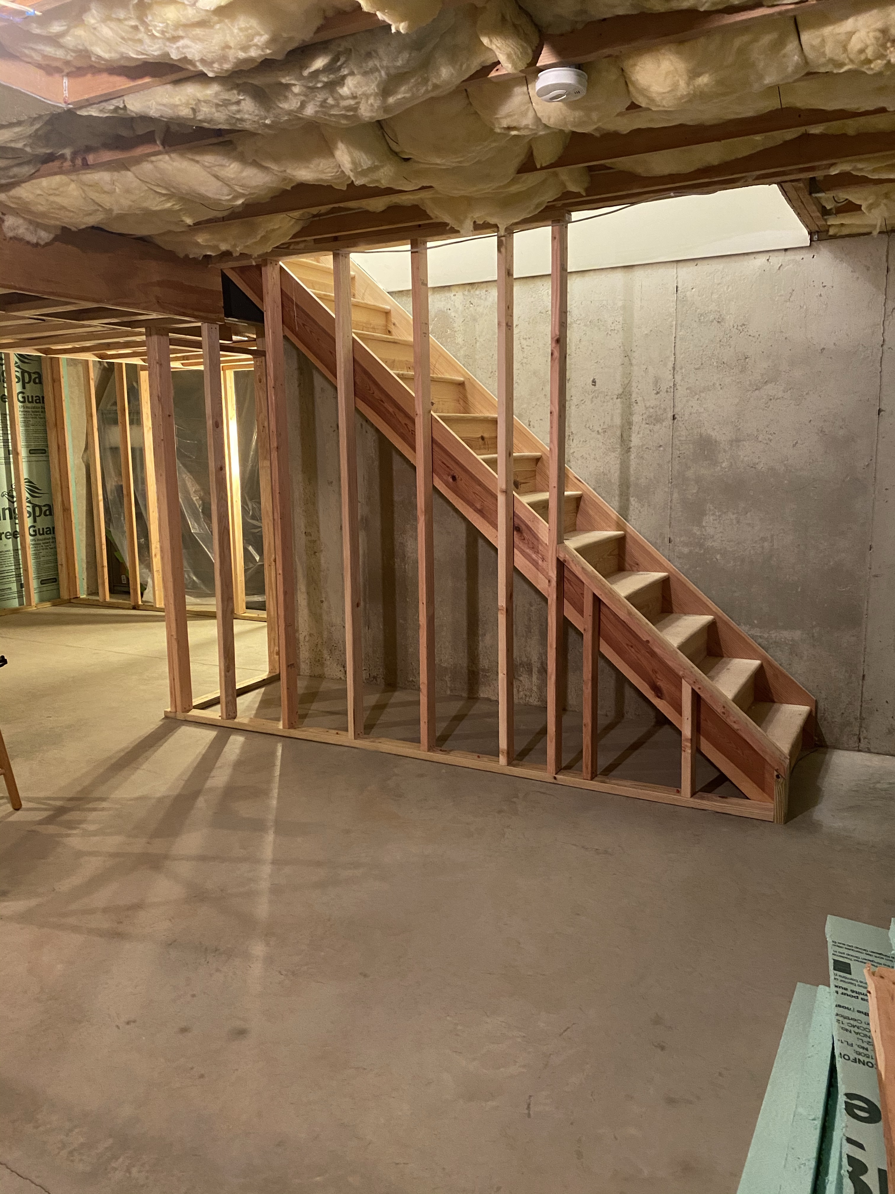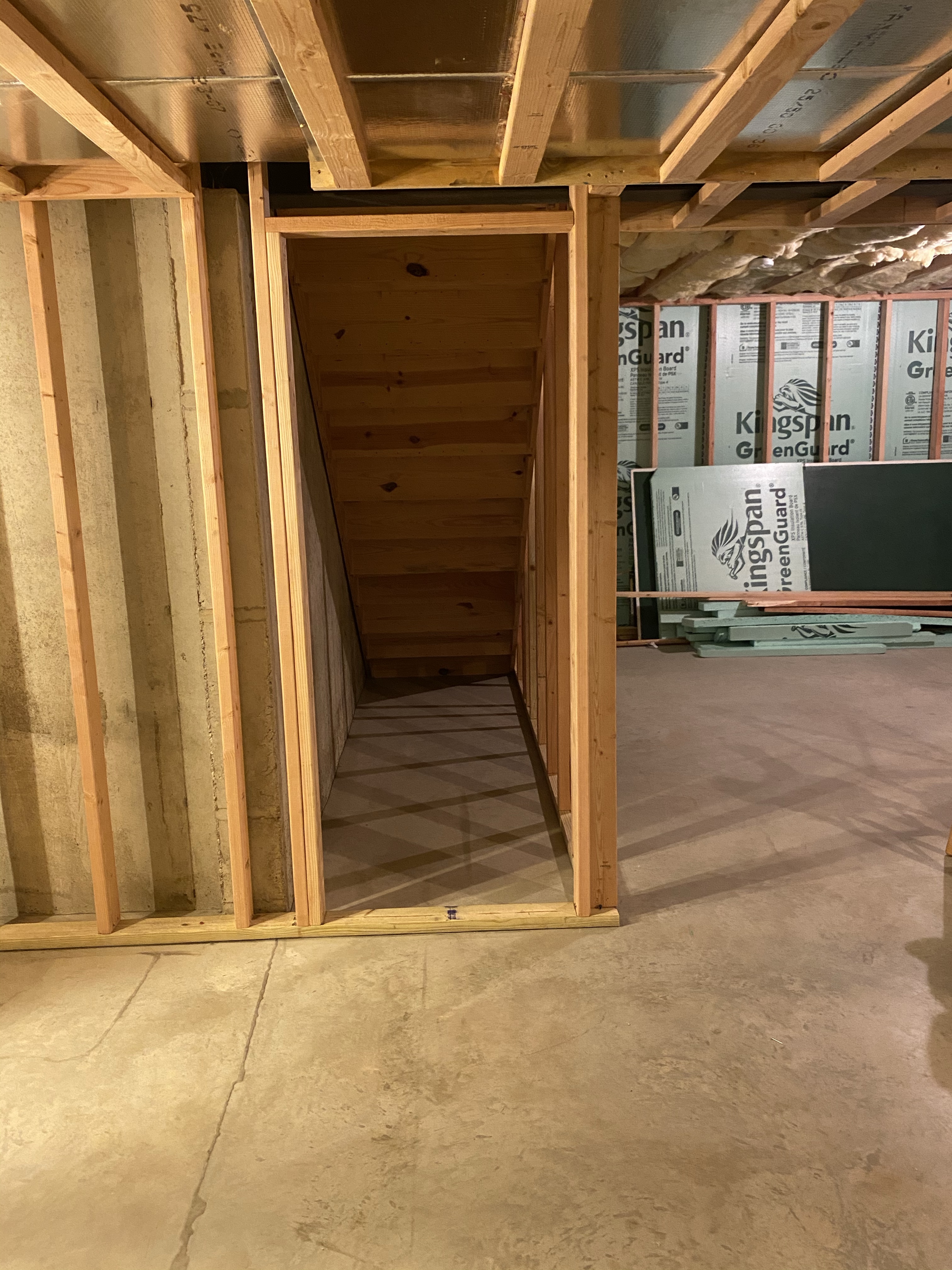 After a rough day yesterday, I got at it after work today. I finished up the door rough in’s for the utility and AV room as well as the stairwell wall. Gotta be honest, I’m pretty proud of the framing for the banister system at the bottom of the stairs. Didn’t think I’d get the angles right but I somehow nailed it (hah, nailed it) on the first try.