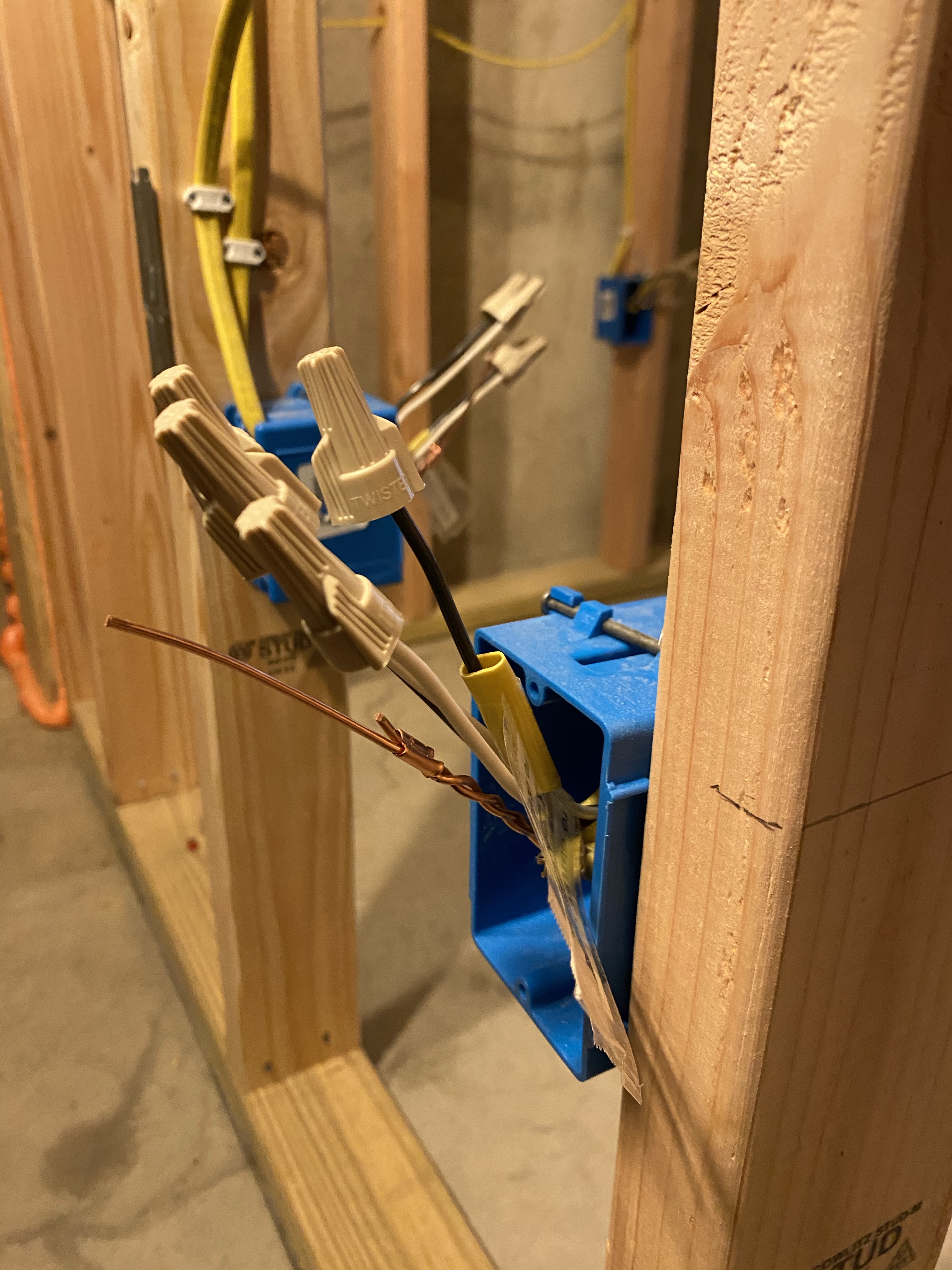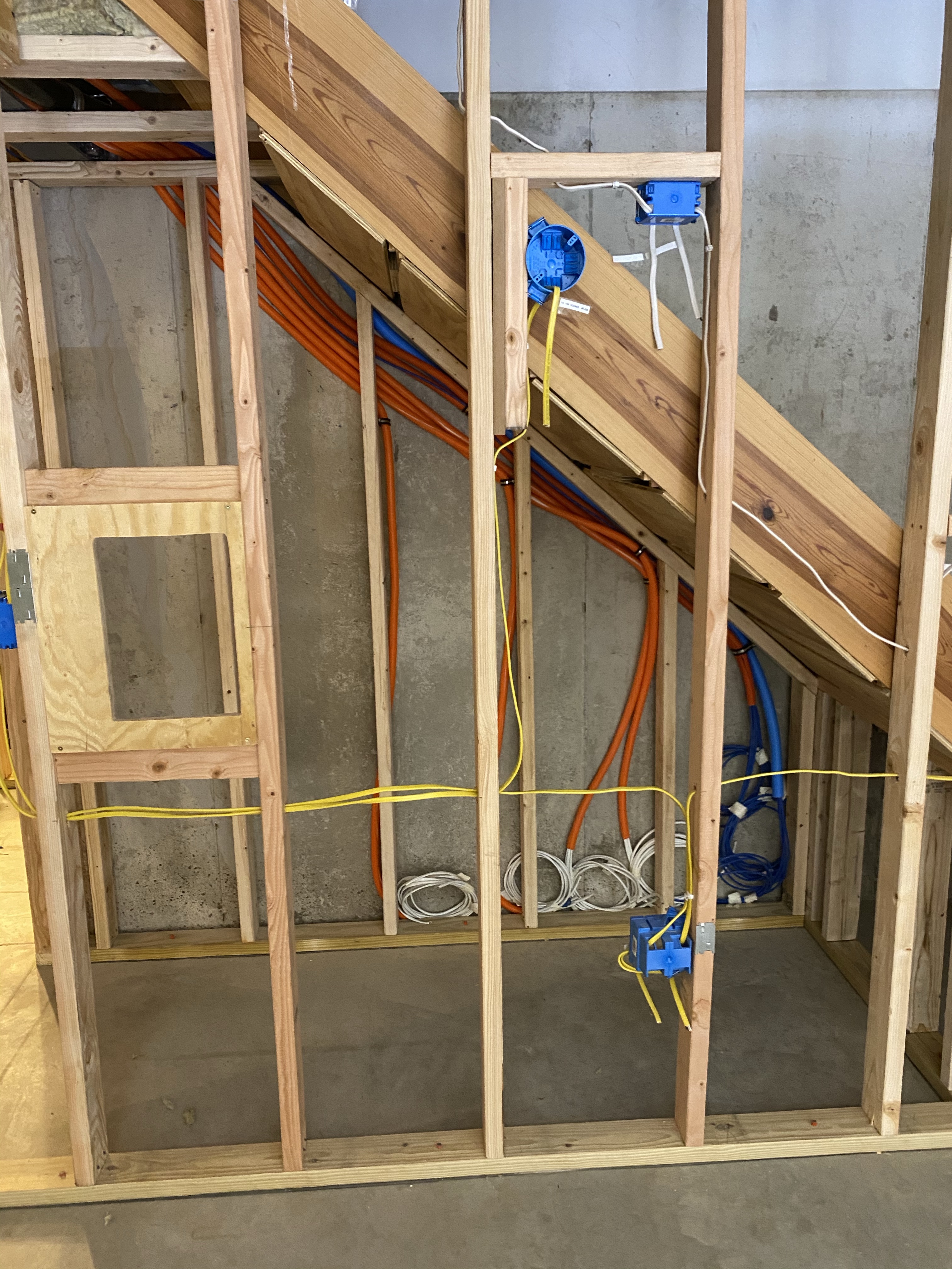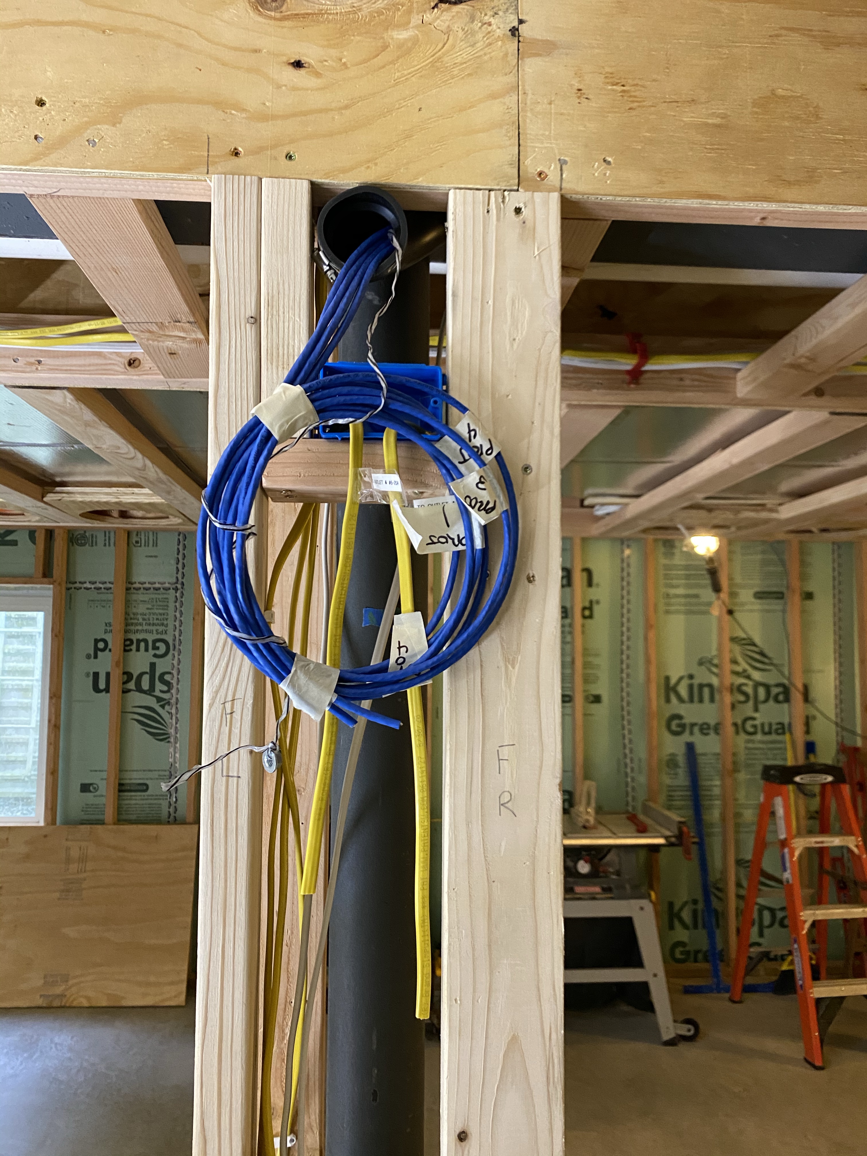 6. Repurposed the EMT as behind wall conduit for the wires I’m running from the ceiling projector conduit. There will be an 8” access panel on the ceiling of the AV room to access those conduit runs. I also secured all of the wires roughly where they will live once the insulation and drywall is up.