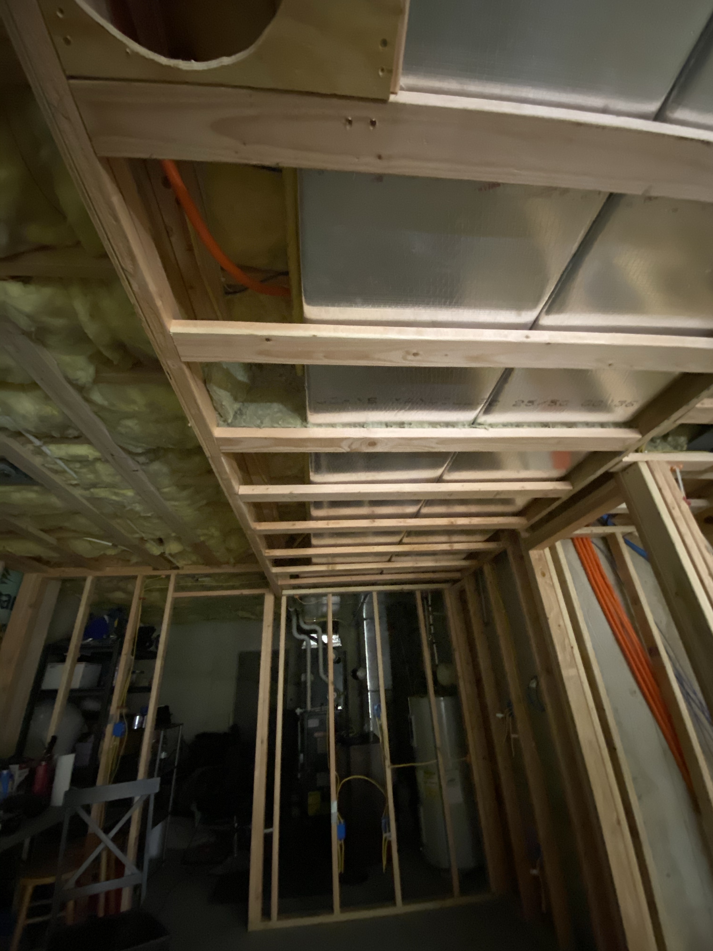 3. Installed the screw surface for the projector which should make it much easier to hang once the drywall is up. Won’t need to find a stud because it’ll all be wood. (Can’t find a picture of that, but I’ll get one up next time)
