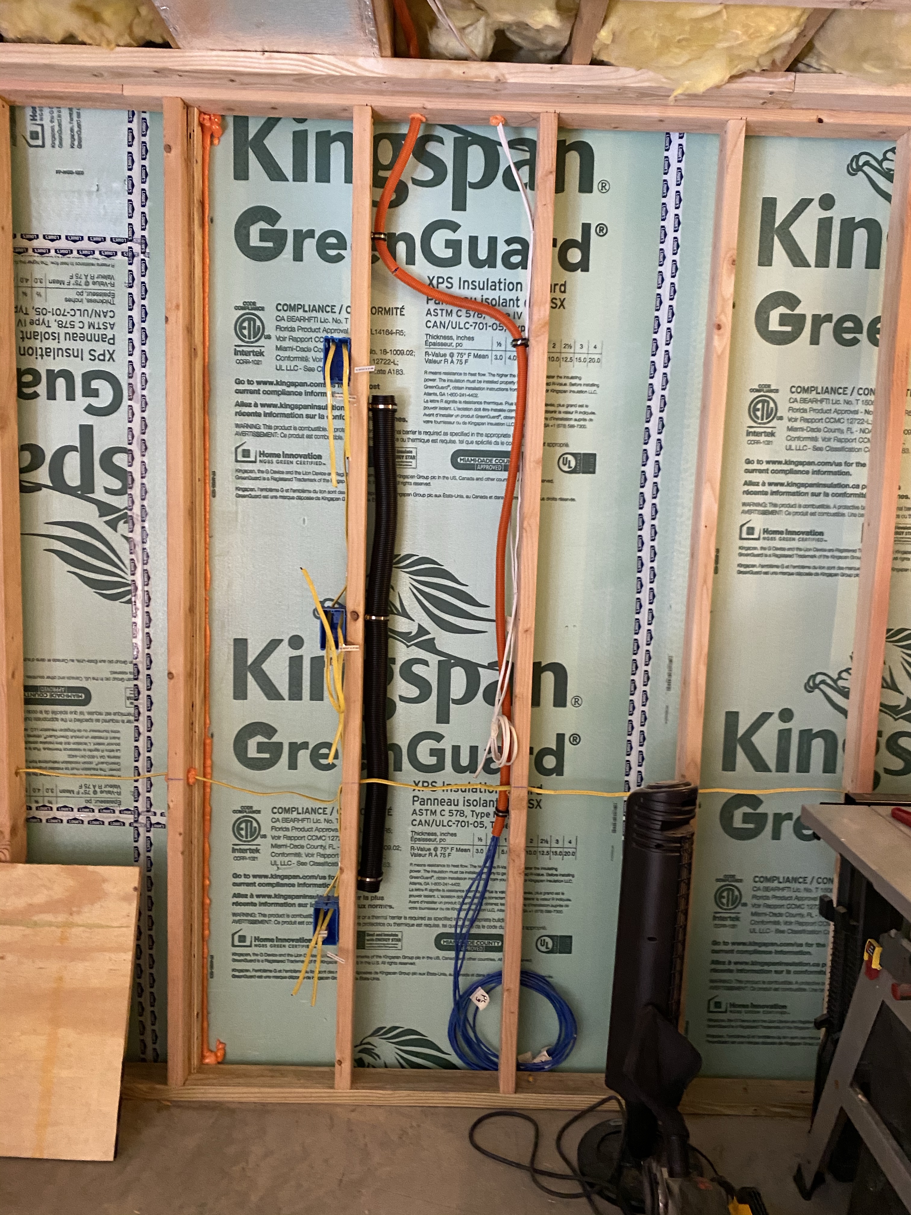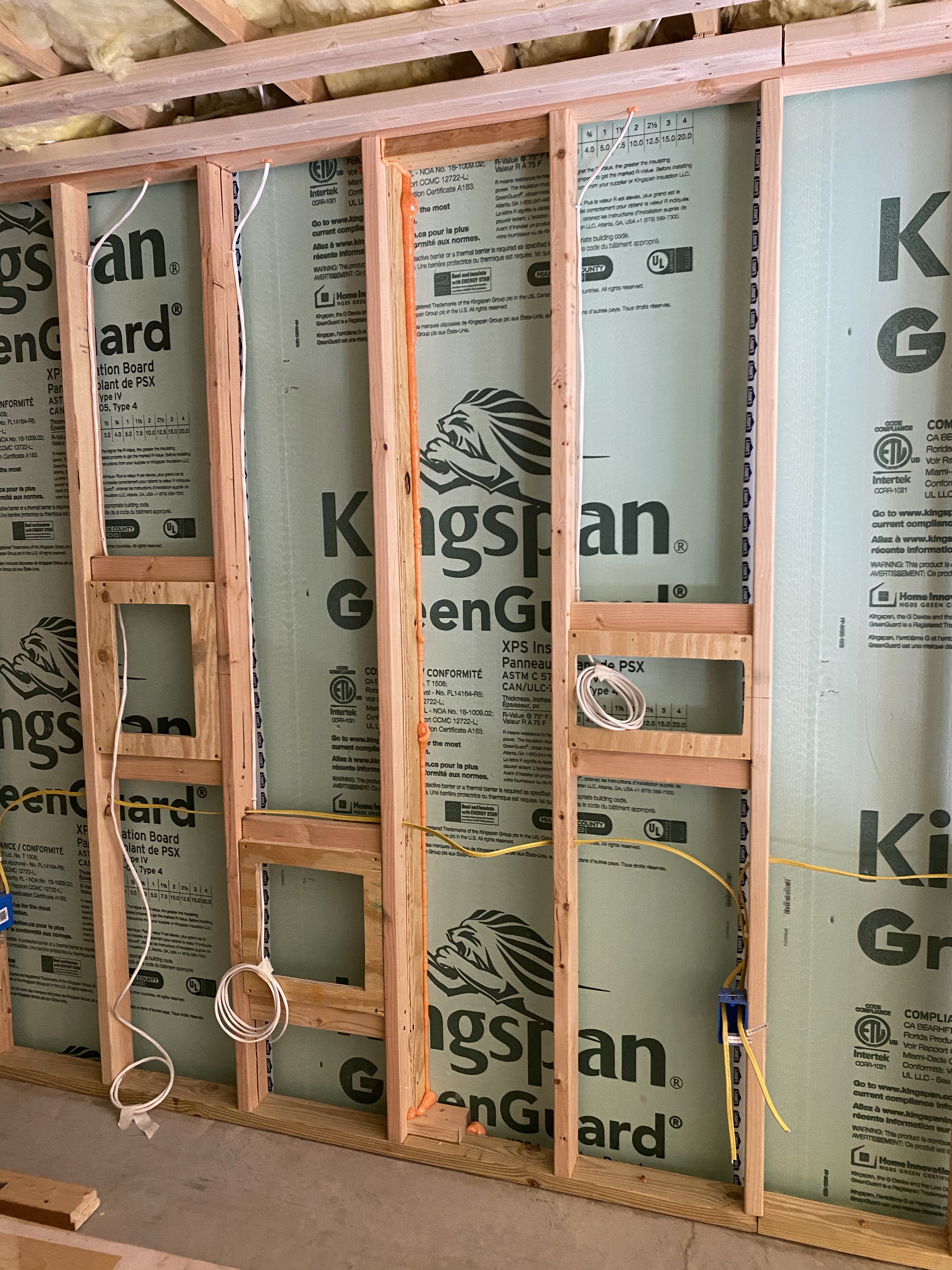 5. Installed fire blocking….everywhere lol. Well not everywhere, but at least every 10’ horizontally. I already installed vertical fire blocking as part of my framing, so I didn’t need to worry about that. So how did I install the horizontal fire block? I used 3/4” plywood in all areas with gaps on horizontal runs of the wall. I filled in any gaps with fire block foam and that’s about it. While I did that, I went through all the vertical holes I made as well as the holes at the horizontal fire block locations and filled them with the fire block foam as well. To finish off the fire blocking, I needed to figure out how to fire block inside the soffit/bulkhead. I ended up using rock wool batt insulation which is approved per code. And boy was that fun….not. I decided to use that because it is what I’ll be using for my exterior wall insulation, so I wouldn’t be wasting any of the left overs.