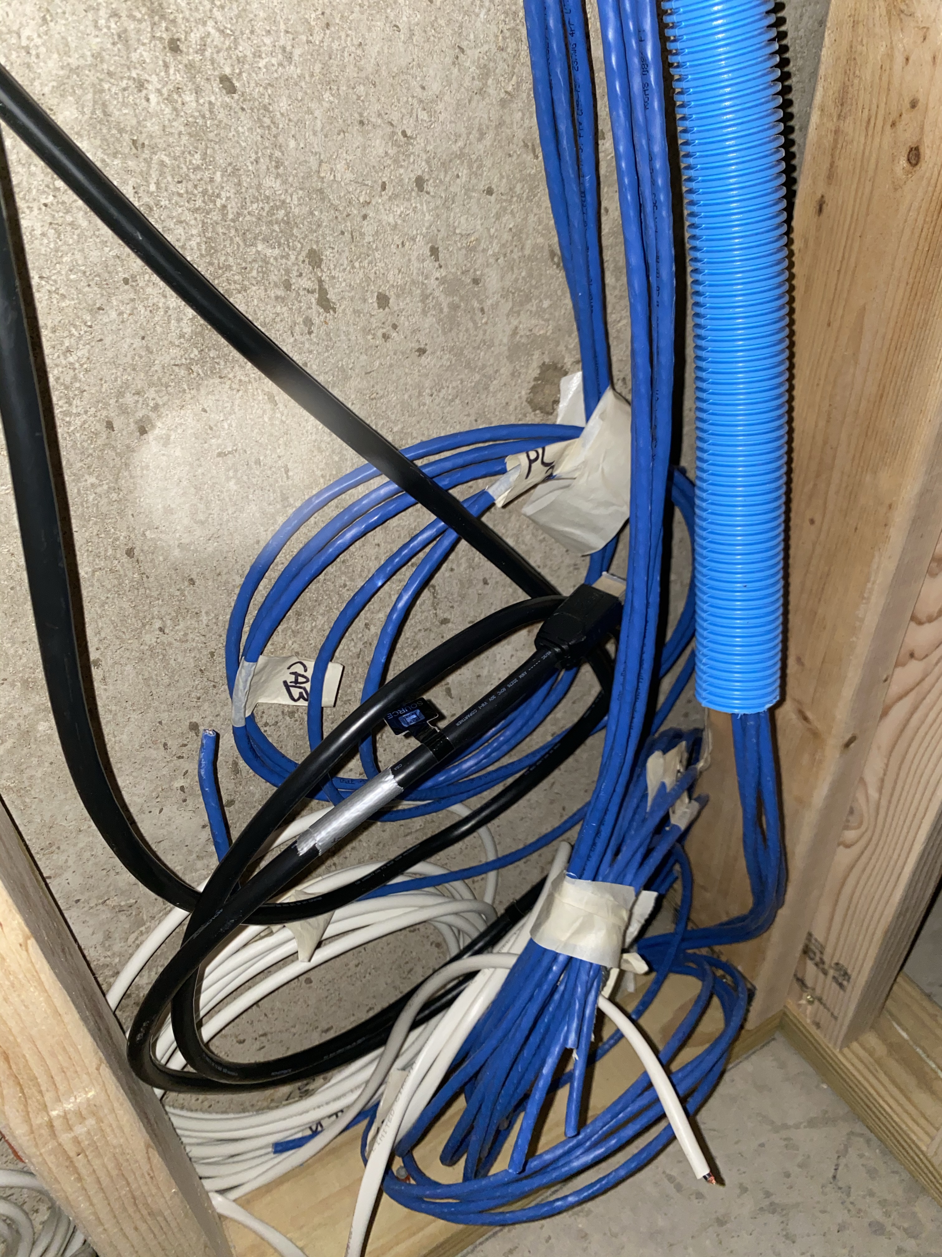 As we waited for the drywall to arrive, the wife and I finished up a few odd and ends to prepare. First she did a terrific job securing all the faced insulation and then while the kids were at their Grammies, we tied all the electric circuits together. I wanted to do this to test for arcs or shorts prior to throwing the drywall up. It turns out the electric is all working and now we even have light in the back utility room. Finally, our monoprice package arrived on Saturday with the HDMI cables and a ton of odds and ends for wire finishing. Since the projector has been sitting in a box for a few weeks I was stoked to bust it out to test that the 25’ and 20’ HDMI cables would work…and they did. After testing I ran the cables to their destination and boom…all rough wiring is complete!