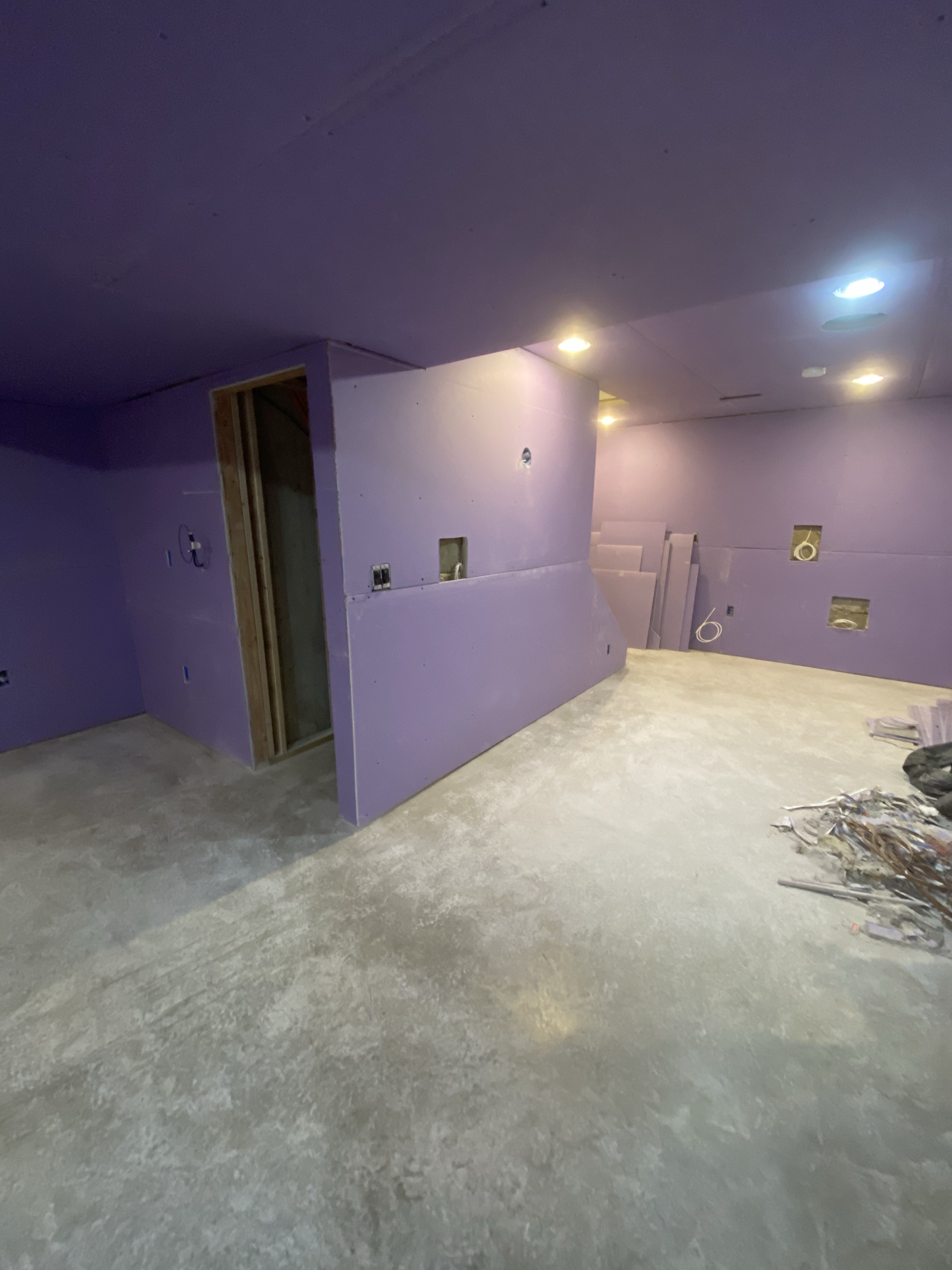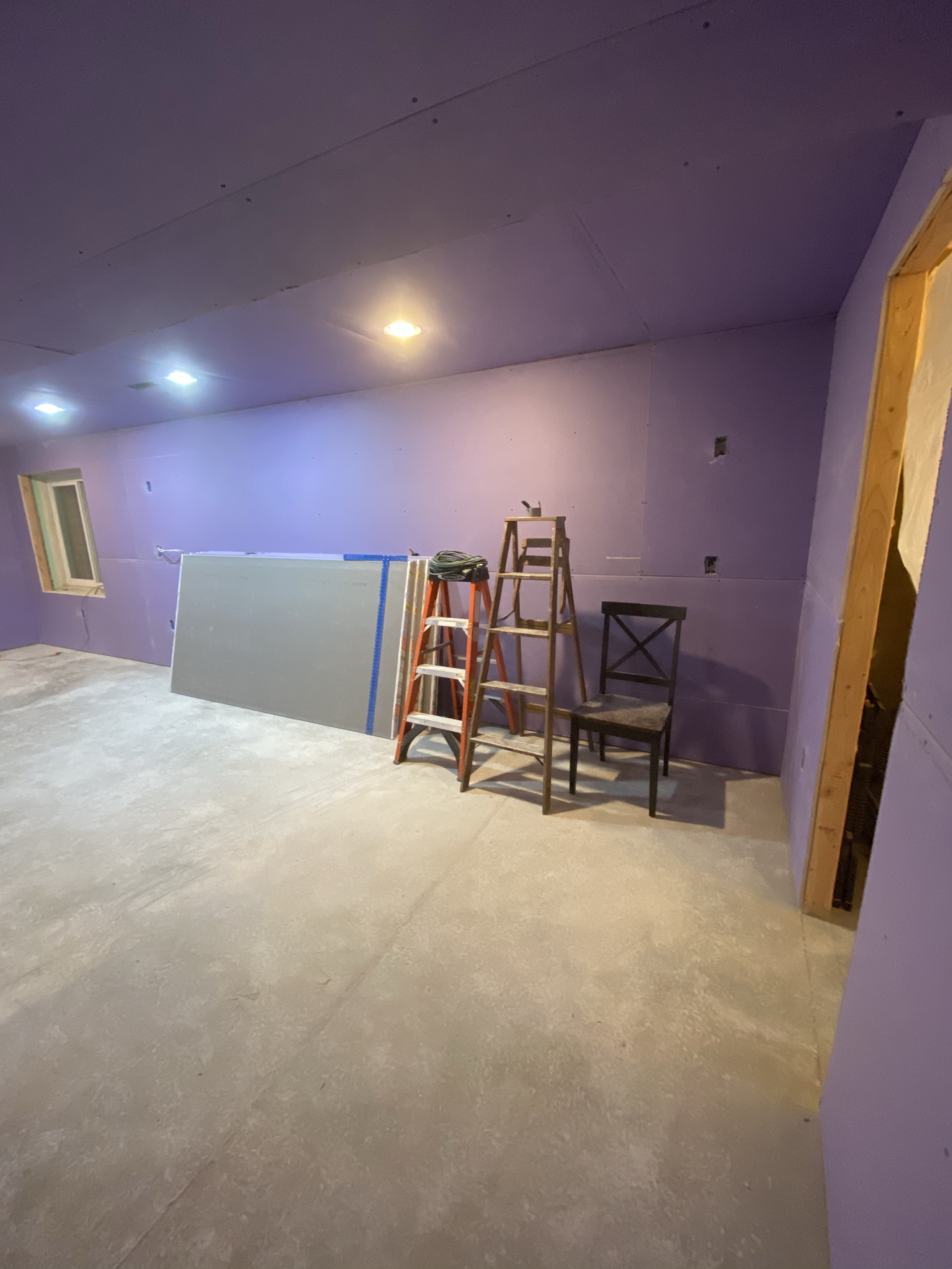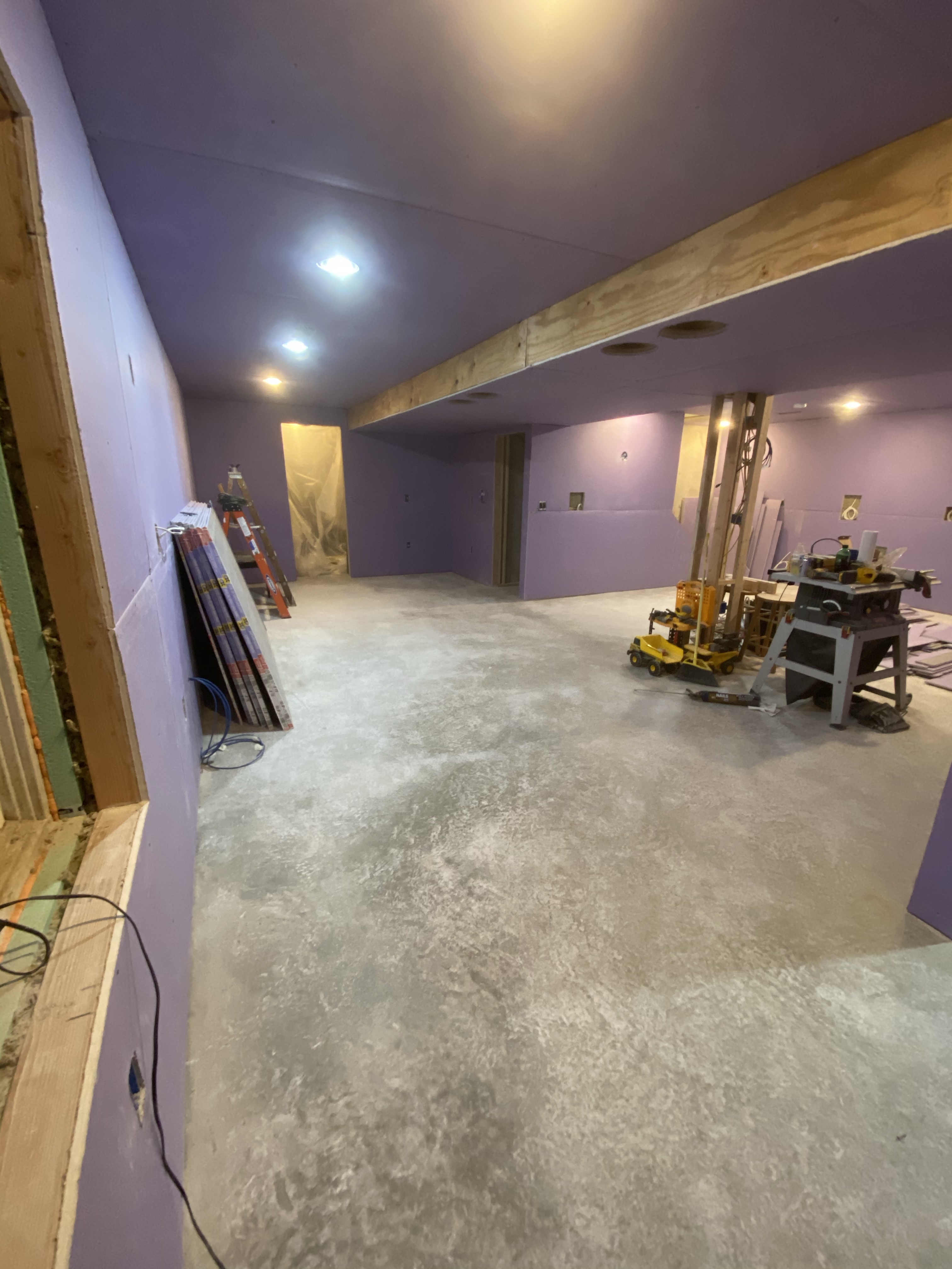 It was a productive evening as I was able to finish covering all the main walls. Just have the closet, pillar, soffit sides and the other side of the stairs left. I should be able to get all that finished tomorrow, except for the stairs. I really need a plan for the stairs. I have about 1/4” from the studs to the surface of the already finished drywall. I’m thinking I can either go with what I’ve got and have a small ledge or go with a 1/4” sheet and try to make it transition well. Something to ponder but I’m leaning towards the ledge, I really don’t need someone going through the wall on the stairwell because it’s only 1/4”. I guess the other option is to throw the 1/2” up there and then laminate a 1/4” sheet over the already finished wall….hmmmm….
